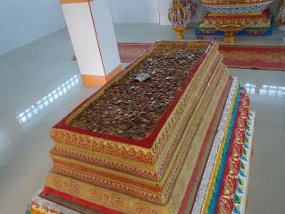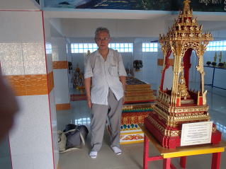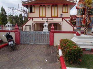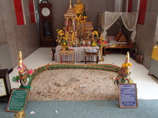町の真ん中にあるWat Chanatip ChlroemというSatun 最大の寺であった。寺男に聞くと確かにあるという。その建物にいったらドアに鍵がかかっている。近くの事務所に行きそこのメガネをかけたインテリ風のお坊さんに仏足石の写真を日本から取りに来たといって、ついでにタンブン(お布施)はどこでやればよいかと聞いたら、事務所の奥の仏間に通してくれた。そこに100バーツおいてきた。坊さんは外に出て寺男を呼び鍵を開けるように指示してくれた。話はスムーズである。