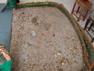 そこに納められていたのは2m弱の4段の仏足跡であった。これは4Roi (シー・ロイ)と称されるものでつま先を見るとそこが4段になっている。シー・ロイとはいえ小型のものであり、近世の作である。私が見たかったのは古代の自然石に刻まれた仏足跡であったが、この写真をとれただけでも大満足である。狙いにしていた2個のうち1個の写真がとれたのだからいうことはない。