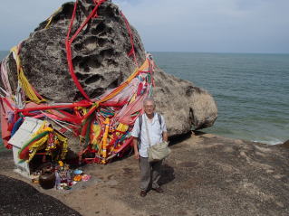 それをみてモーターサイのお兄さんは山のほうの道に乗り込み、海岸に見える其の巨大岩まで連れて行ってくれた。まるでトドが鎌首を持ち上げているような風情である。巨大岩の前のくたびれたようなジサマが私の旅姿である。これが仏足跡なら世界一といえるかもしれない。私はカオ・センには仏足跡が2箇あるという調査を信じて、これをNo.1と見立て、No.2を探そうとしたが手がかりはなく、あきらめてグリーン・ワールド・パレス・ホテルに行くことにした。朝から実は何も食べていないうちに午後4時ごろになっていた。