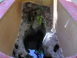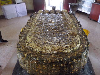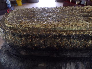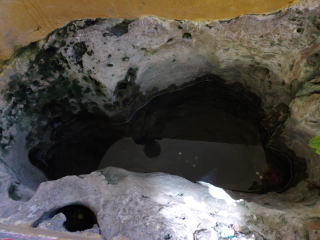 ところが仏足跡がどこを見ても見つからない。すると塔のてっぺんから降りてきたブンヤリットさんが連れて行ってくれたのは井戸だとばかり思っていたところである。それは岩盤を大きく深くくりぬいたもので、長さが3m近くあった。屋根がかかっていて近くにコップなどが並べてあったので私はてっきり井戸だと思って見過ごしていたのである。確かによく見ると仏足跡である。これは岩盤彫りこみ式仏足跡としてはタイでは最大のものではないだろうか。水は飲めるらしく、硬貨の投げ入れ禁止と書いてある。