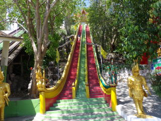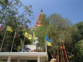 次に向かったのがタ・ムアン(Tha Muang)郡にあるWat Tham Suea(虎洞窟寺院)であり、これはクラビに同名の寺(1279段の石段の上)がある。タ(Tha)とは港や船着き場という意味がある。寺院の玄関には白い虎の像がいくつかおいてある。それよりも驚くのはやけに高い仏塔が2本もて建っていたことである。塔は頂上まで登れる。ブンヤリットさんはてっぺんまで行ったが、脚力に自身の無い私は下でウロウロしていた。私の関心事は仏足跡のみであり、カンチャナブリの眺めなどは2の次であった。