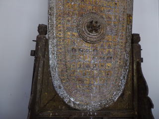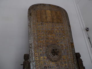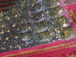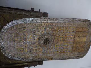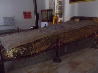 4月30日は、ブンヤリットさんの案内でカンチャナブリ市周辺の3か所を見ることができた。最初に行ったのはカンチャナブリ市から20kmほど南の方に行ったPhra Thaen Dongruang Forest Park内の寺院であった。かなり大きい規模で仏足跡は2か所に分かれて存在した。下の写真で最初のものは仏足跡ではなく、ブッダの涅槃の時のベッドの模型だという。5~6mのかなり大きいものである。ブッダのベッドなるものを見たことある人がいたとも思えぬが並はずれて巨大なものであった。これを「仏足跡」として紹介した人もいるらしいが、同時に作られた仏足跡がこの寺には存在する。次の写真はアユタヤ時代に作られた仏足跡であり、細密な模様が美しく描かれている。長さは約1.5m。鉄格子の中に立てかけてあり、カメラを格子の中に突っ込んで撮影した。